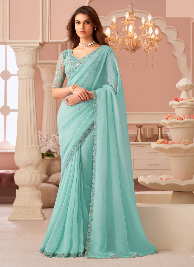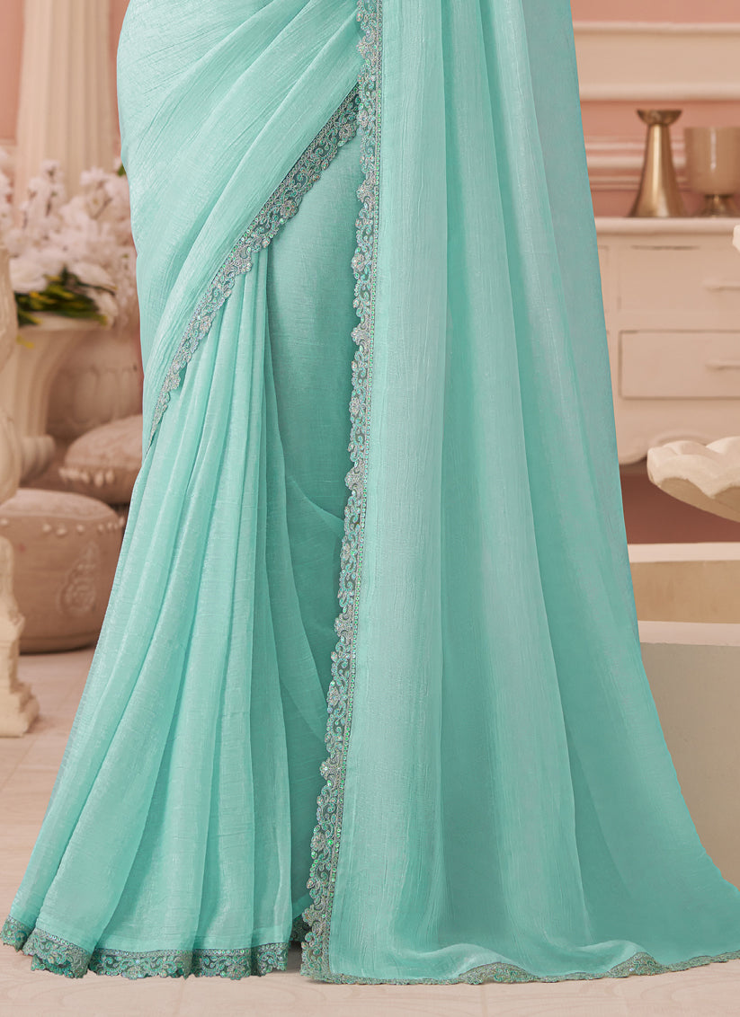 Fascinating Aquamint Embroidered Georgette Party Wear Saree