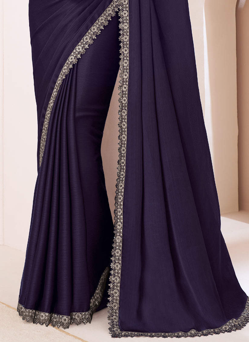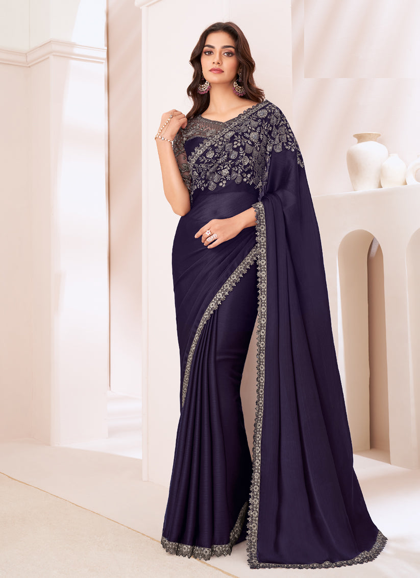 Spectacular Aubergine Satin Chiffon Embroidered Designer Saree