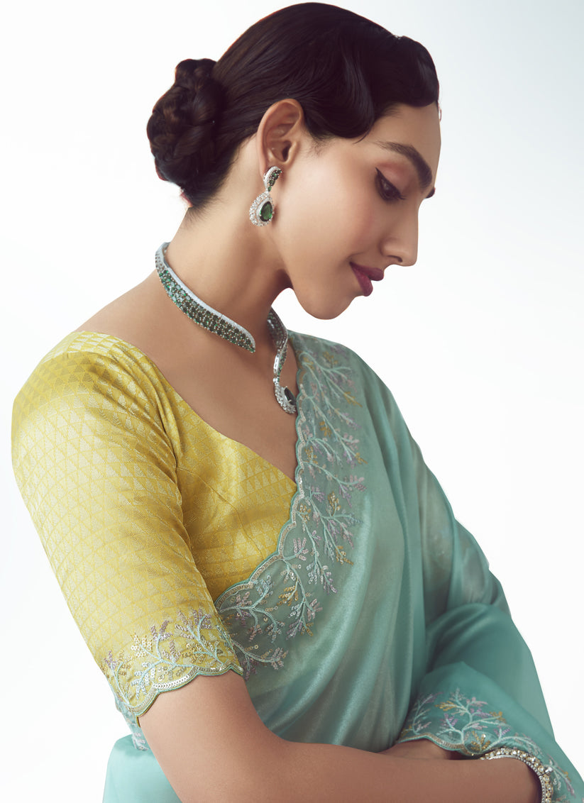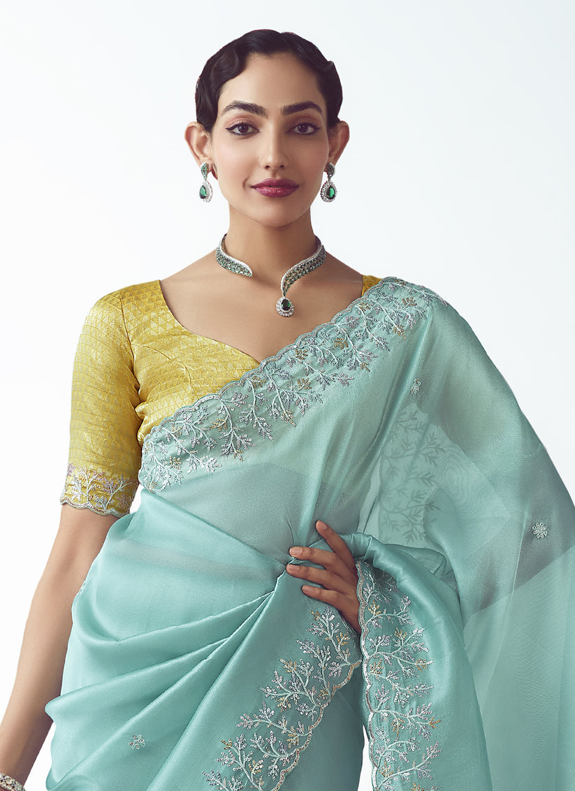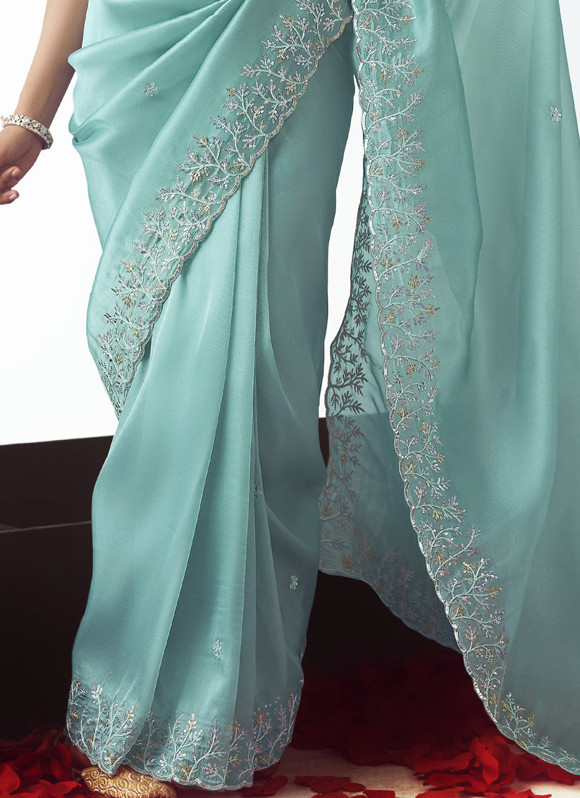 Awesome Aqua Blue Tissue Organza Embroidered Wedding Saree