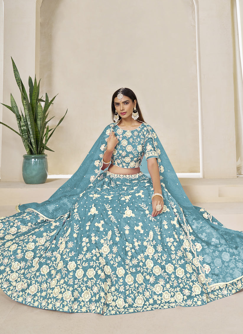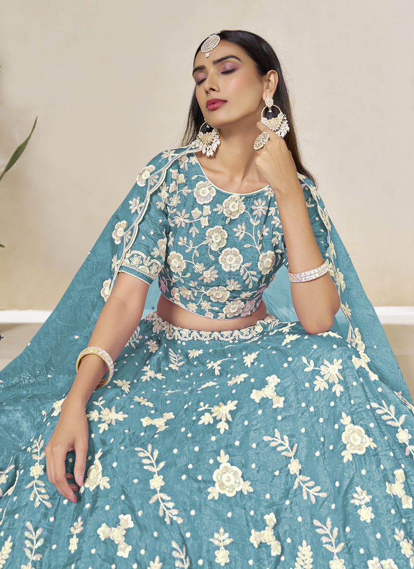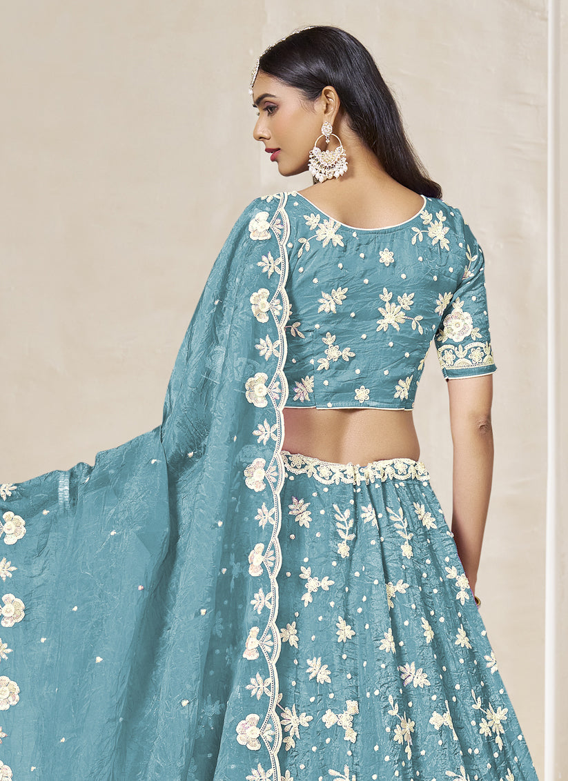 Awesome Firozi Crush Organza Heavy Embroidered Lehenga Choli Set for Wedding