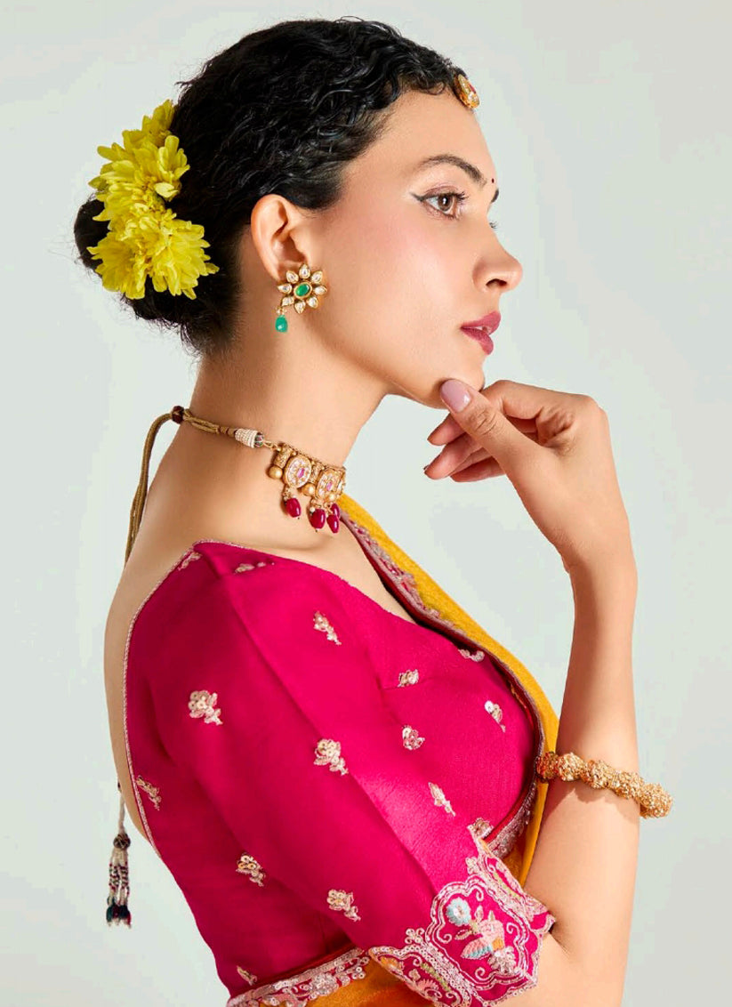 Beautiful Golden Yellow and Hot Pink Organza Tissue Embroidered Designer Wedding Saree