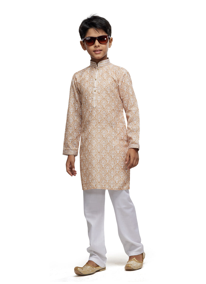 Beige Boys Kurta Pyjama Set Fabric: Top - Cotton, Bottom - Art Banarasi Silk Work: Digital Print Dispatch Time: 15-20... Read more