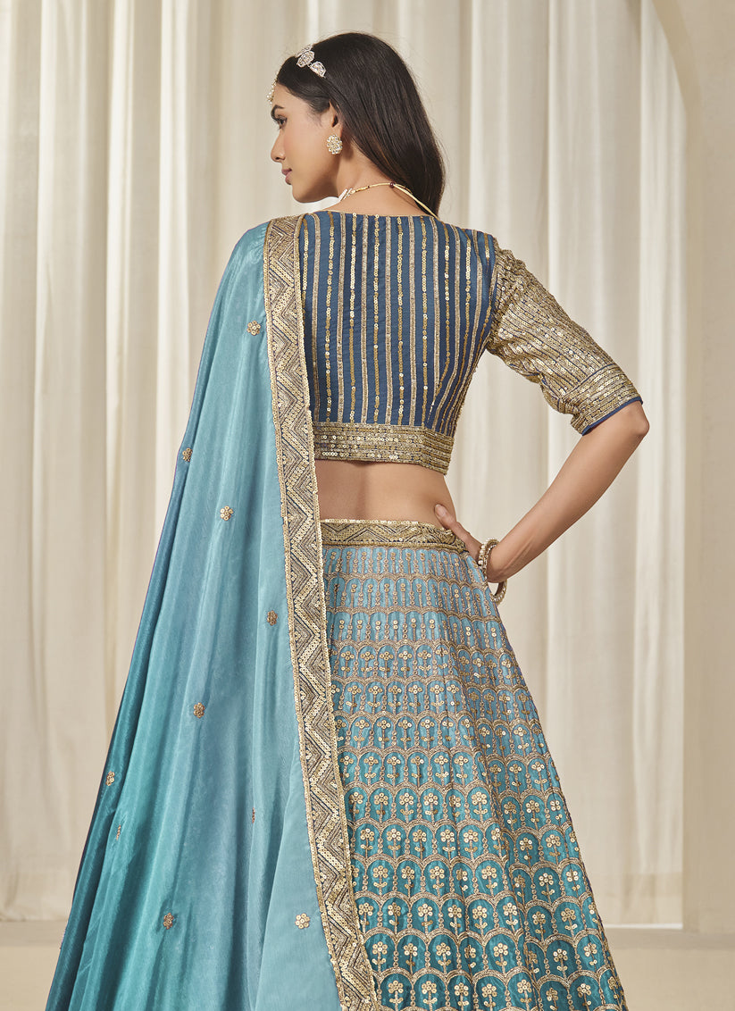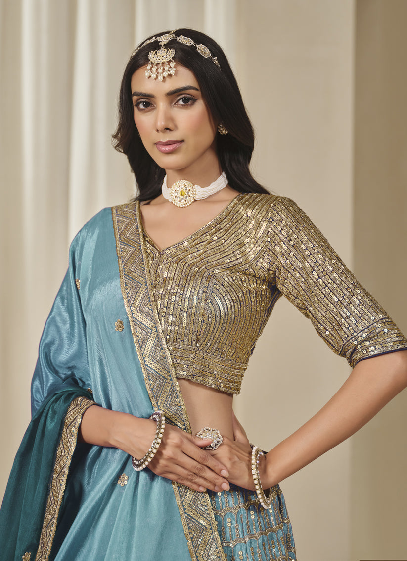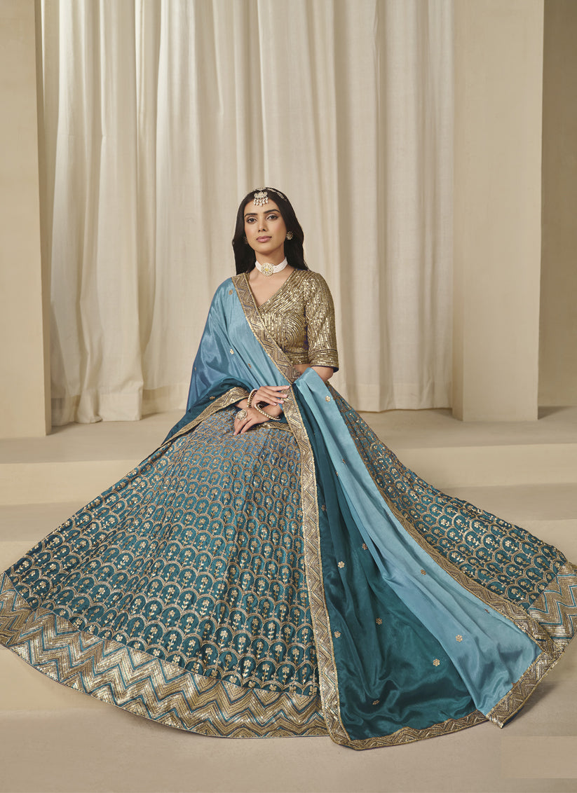 Bewitching Teal Blue Heavy Embroidered Premium Chinnon Silk Lehenga Choli Set