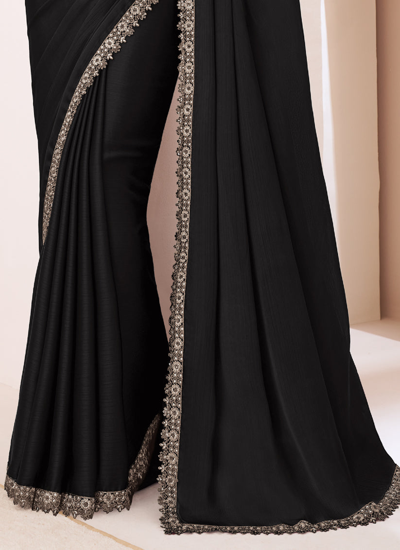 Astonishing Black Satin Chiffon Embroidered Designer Saree