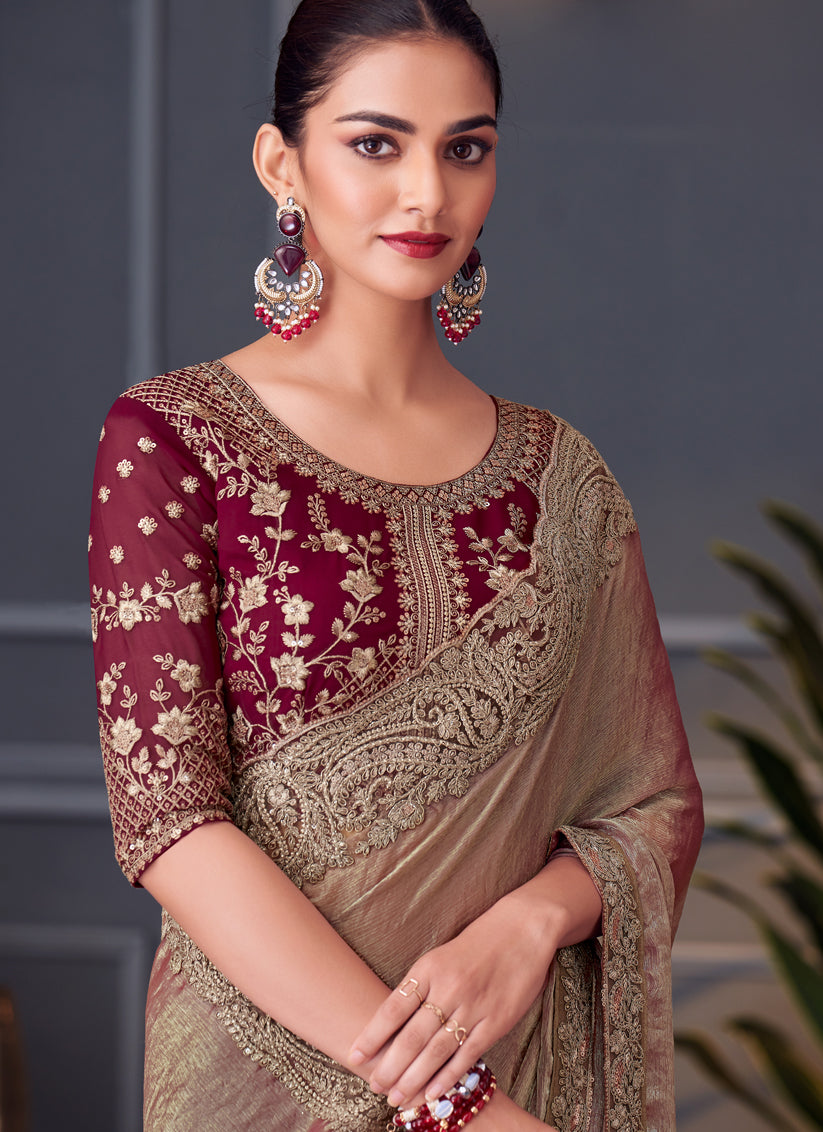Outstanding Bronze Double Tone Silk Embroidered Designer Saree