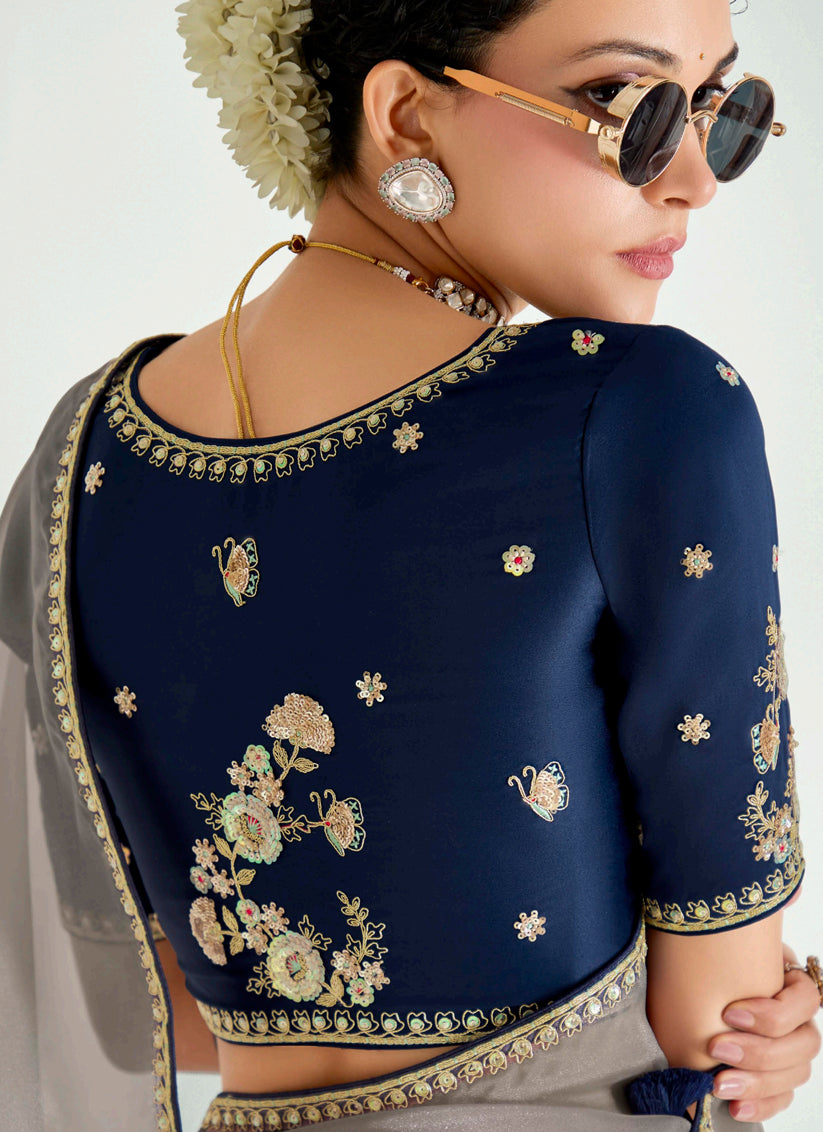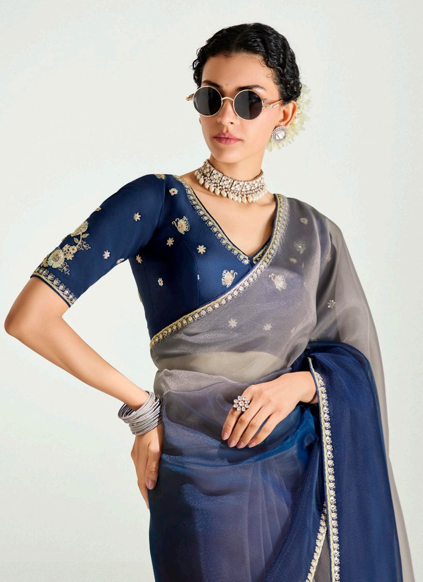Captivating Dusty Grey and Prussian Blue Organza Tissue Embroidered Designer Wedding Saree