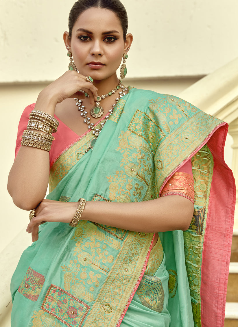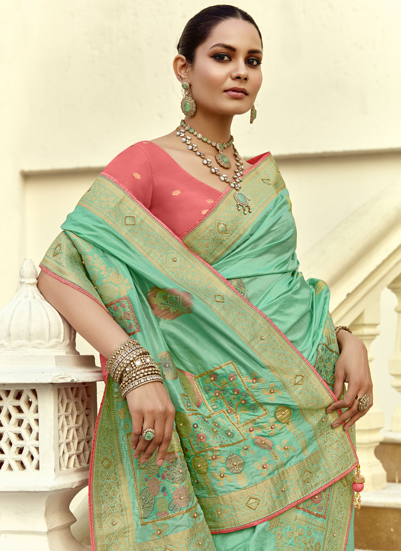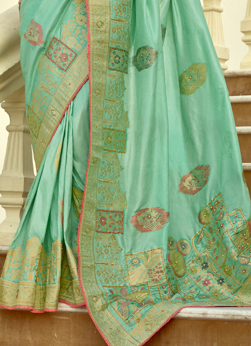 Charismatic Turquoise Dola Silk Handwork Wedding Saree