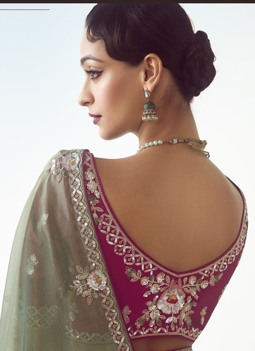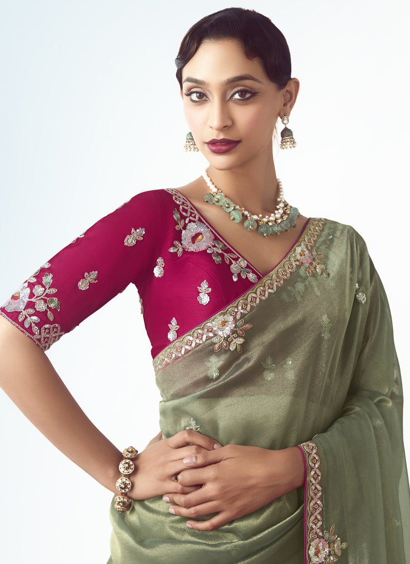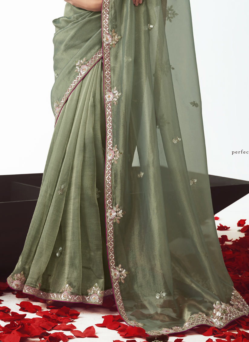 Elegant Sage Green Tissue Organza Embroidered Wedding Saree
