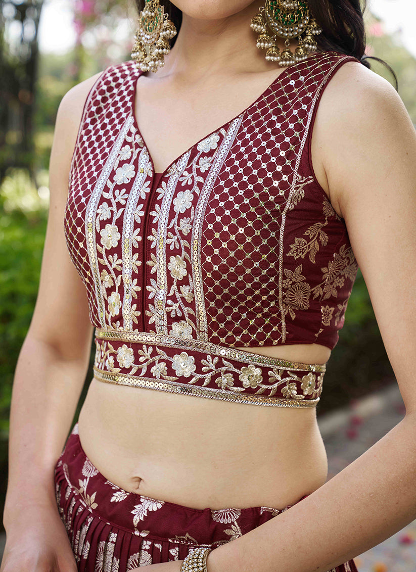 Fashionable Maroon Zari Dola Silk Jacquard Embroidered Wedding Lehenga Choli Set
