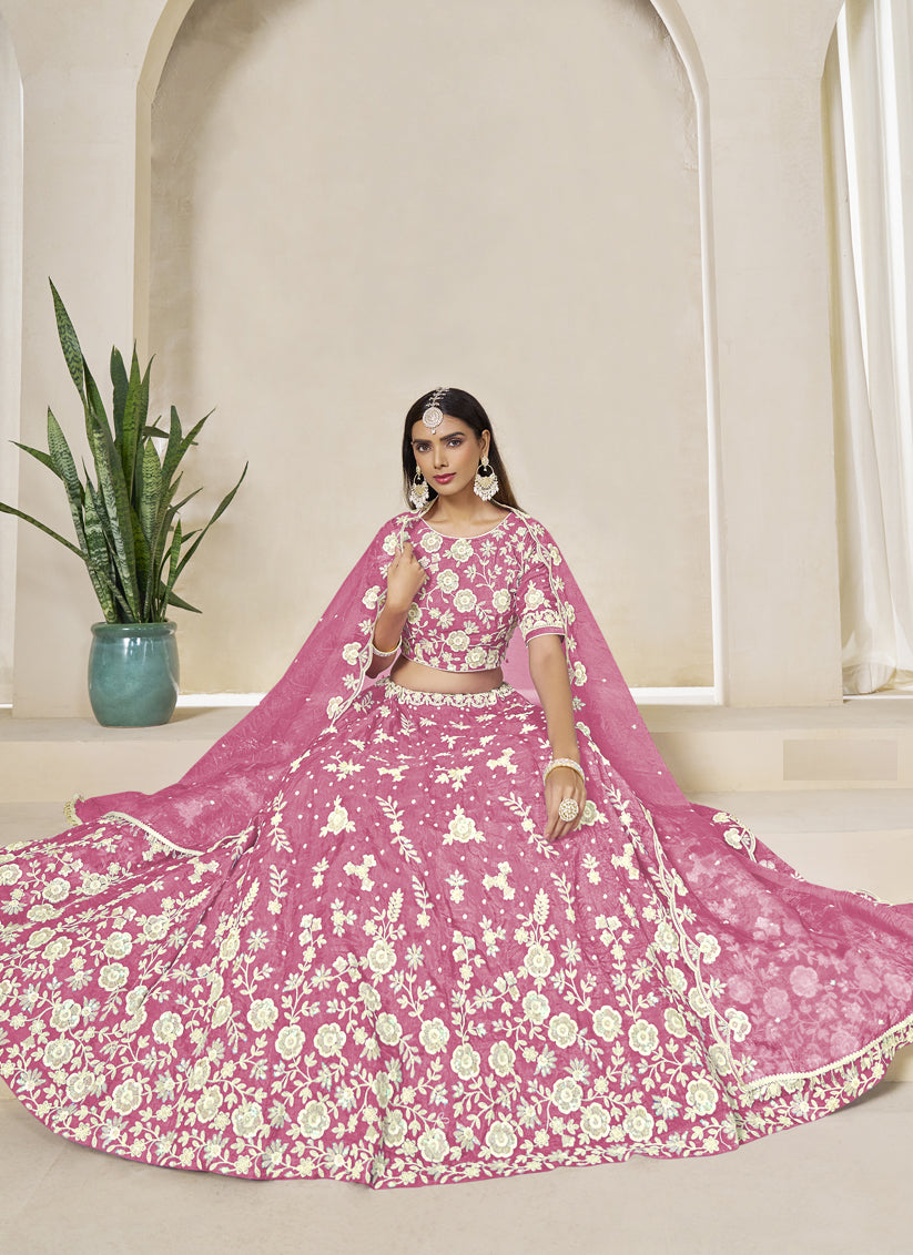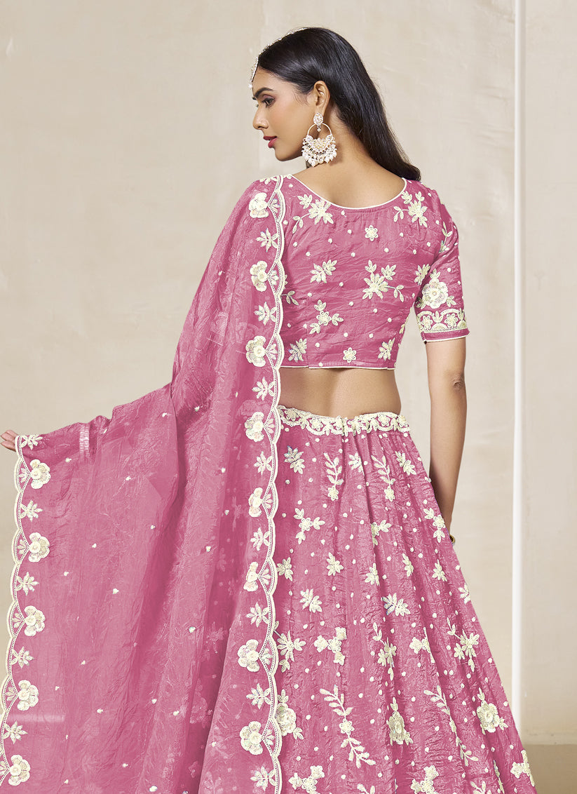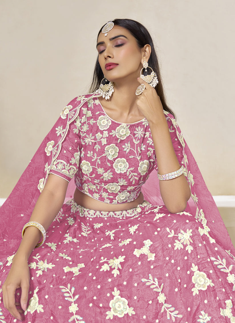 Glamorous Cherry Pink Crush Organza Heavy Embroidered Lehenga Choli Set for Wedding