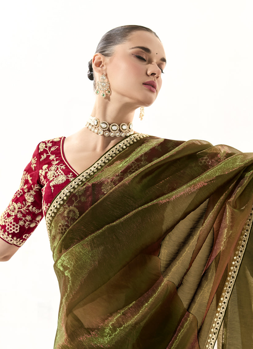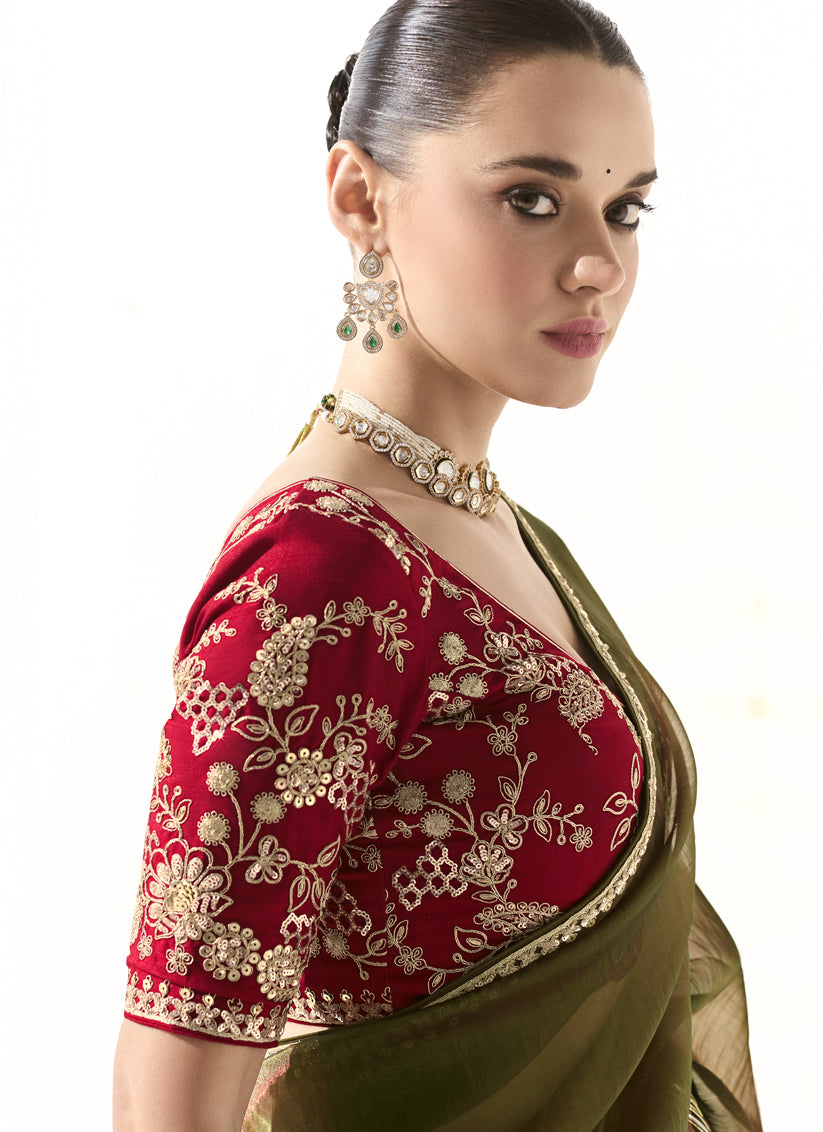 Gorgeous Mehendi Green Tissue Embroidered Designer Wedding Saree