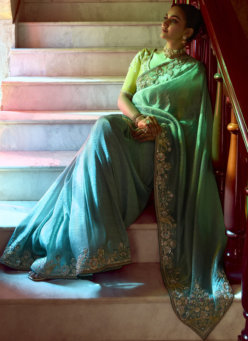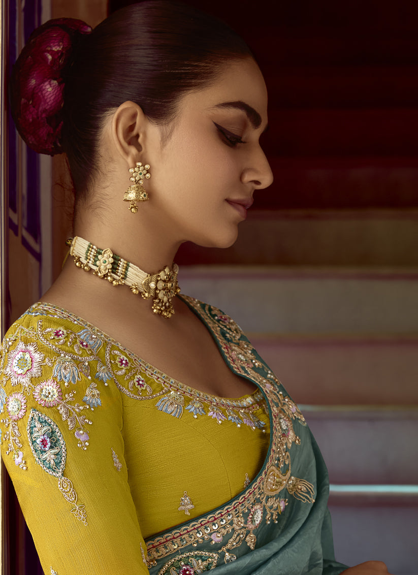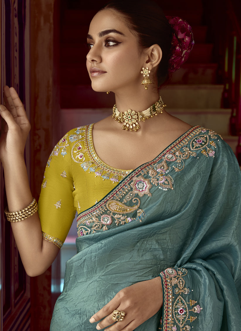 Impeccable Teal Grey Embroidered Designer Wedding Saree