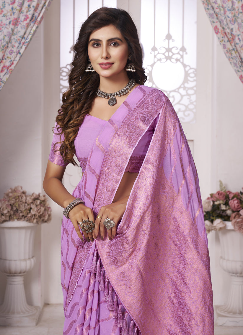 Lavender Georgette Designer Saree Fabric: Georgette Work: Weaving Work Dispatch Time: 10 Days Please Note: The first wash of the... Read more
