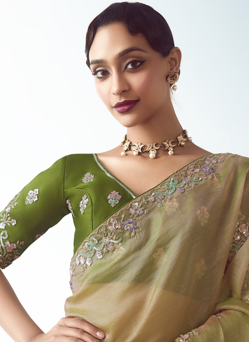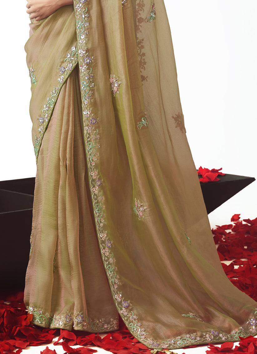 Magnetic Beige Tissue Organza Embroidered Wedding Saree