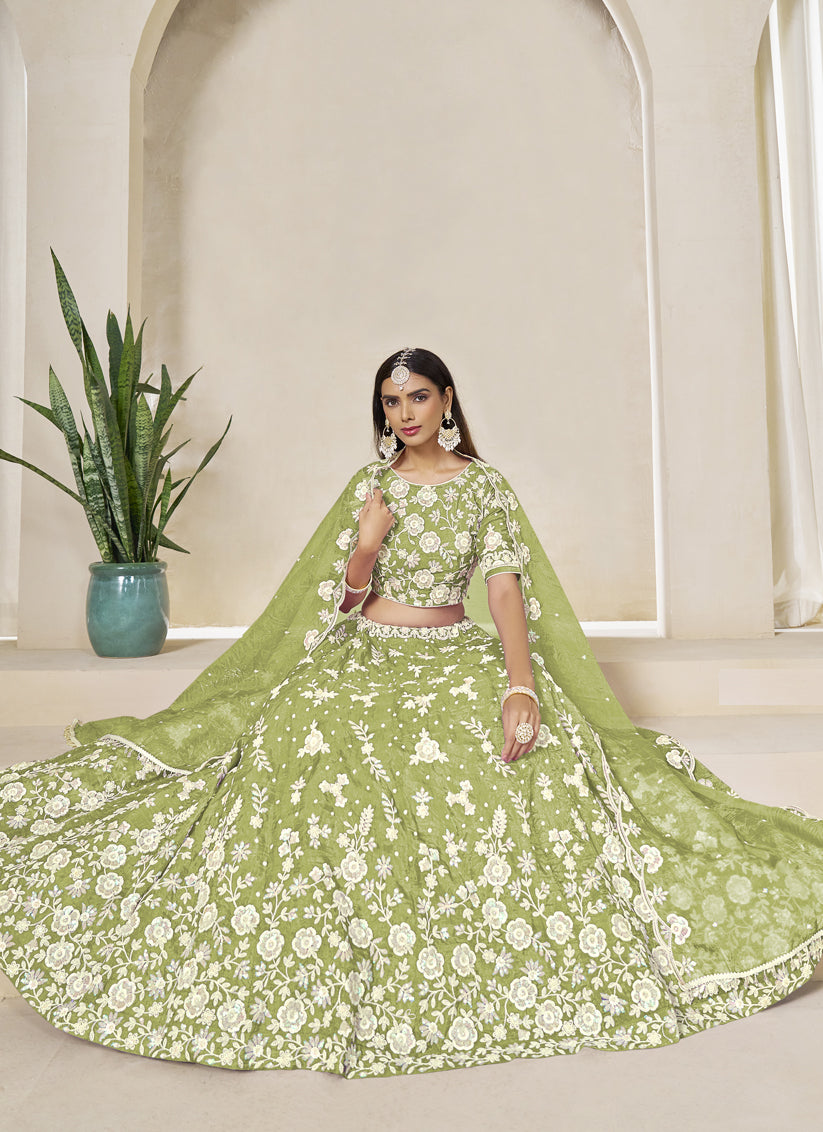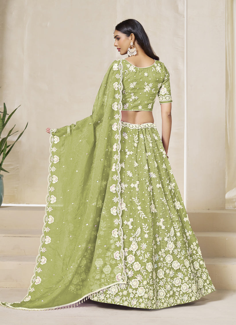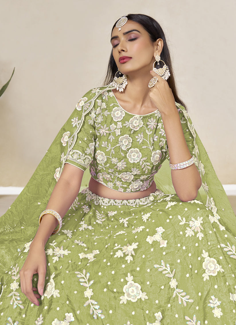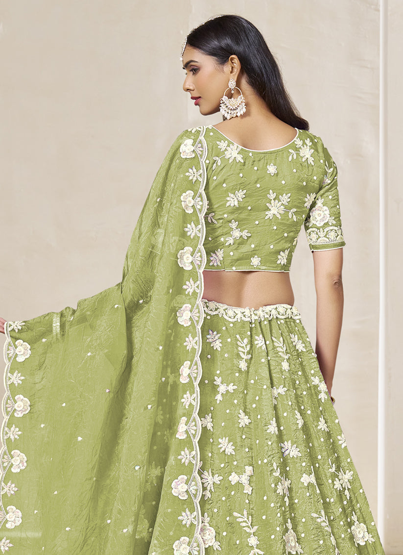 Magnetic Pear Green Crush Organza Heavy Embroidered Lehenga Choli Set for Wedding