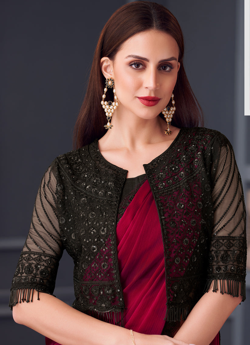 Striking Maroon Satin Chiffon Embroidered Designer Saree