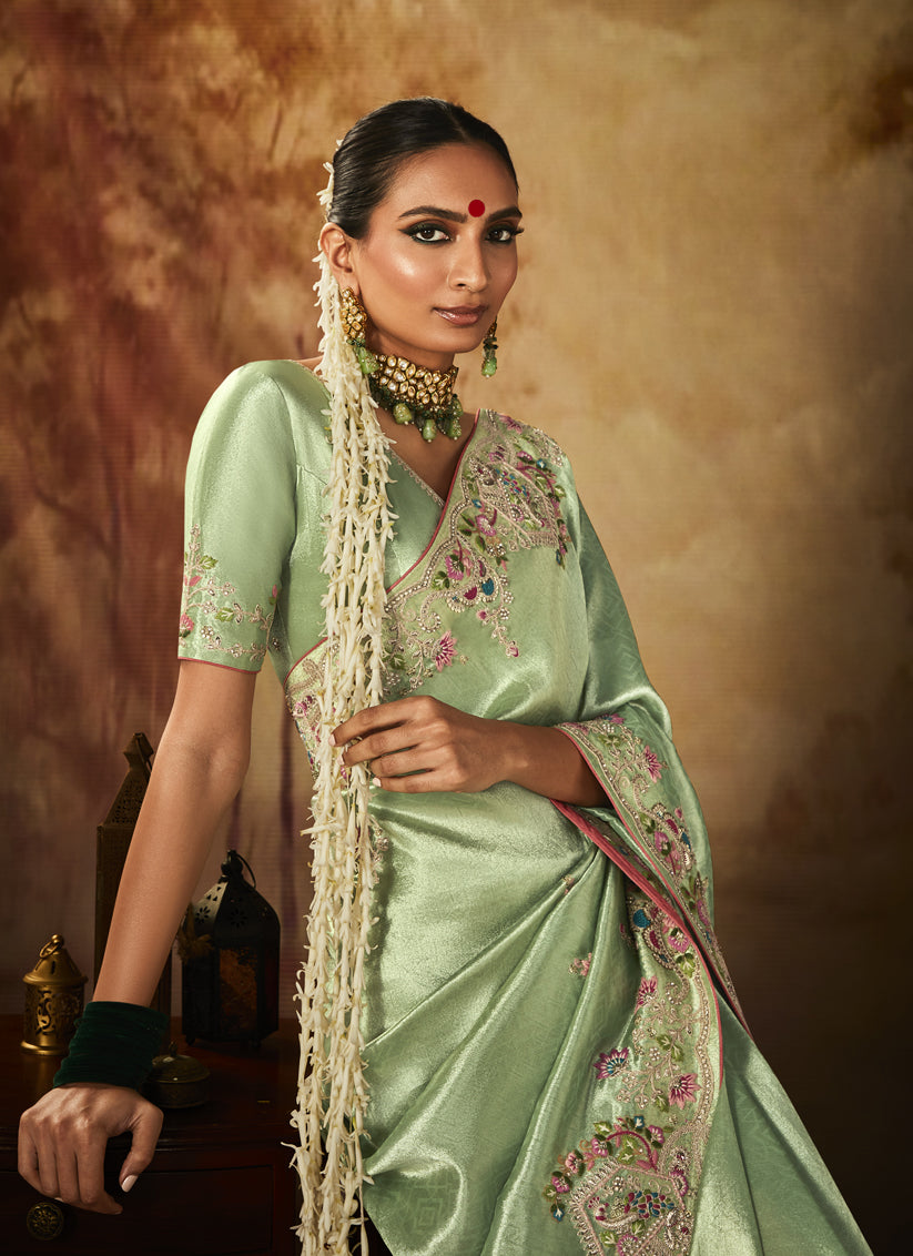Mint Green Silk Embroidered Saree Fabric: Silk Work: Heavy zari, resham, thread and zari embroidery with stone and diamond work... Read more