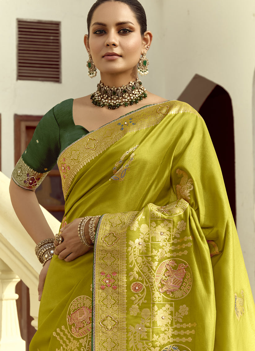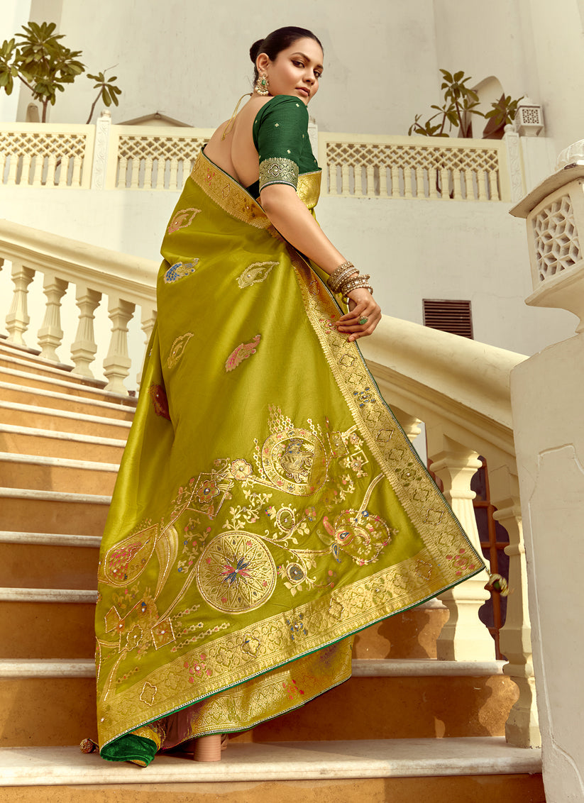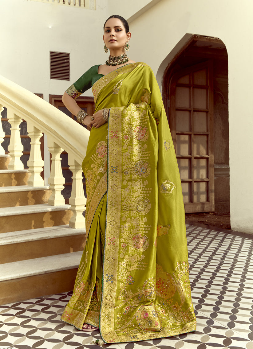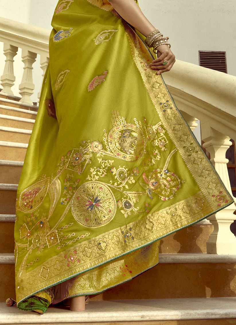 Outstanding Chartreuse Green Dola Silk Handwork Wedding Saree