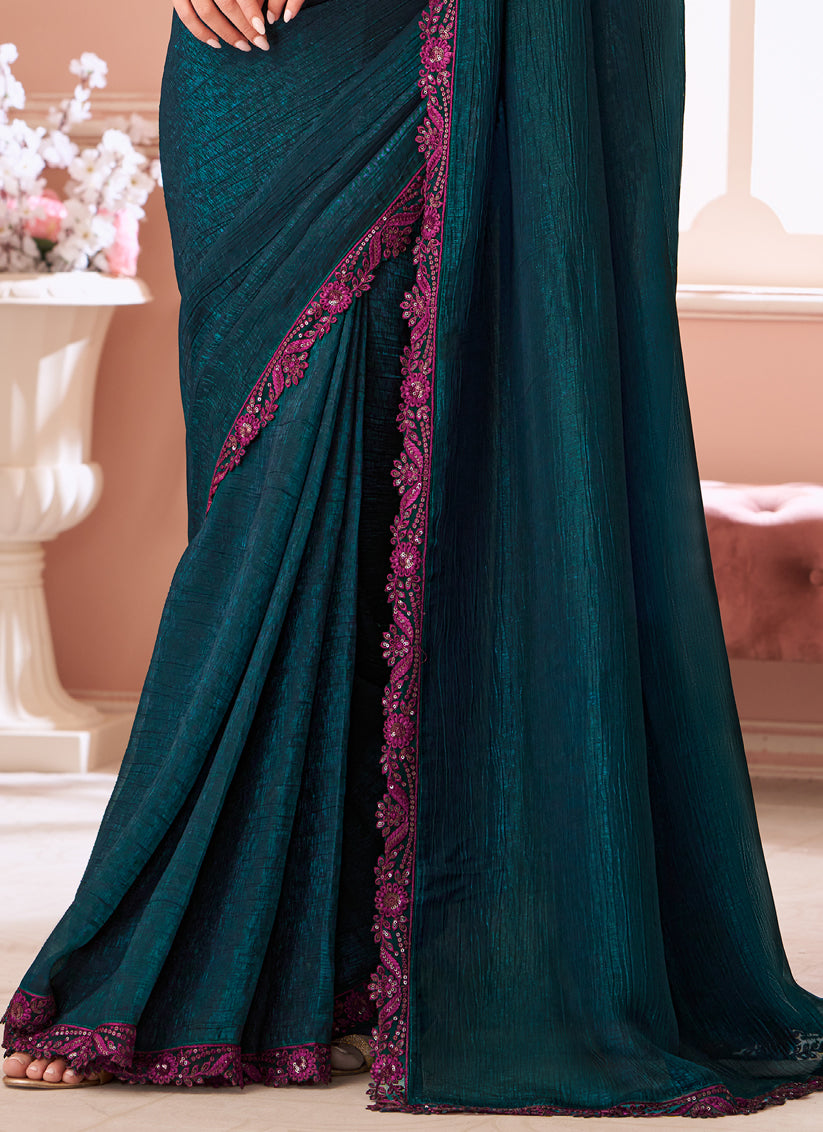 Pretty Peacock Blue Embroidered Georgette Party Wear Saree
