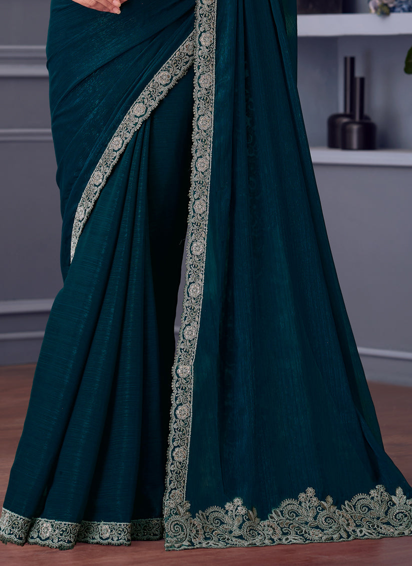 Incredible Peacock Blue Shimmer Georgette Embroidered Designer Saree