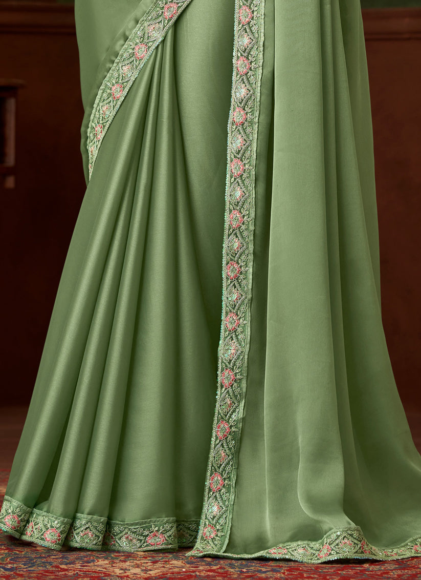 Sweet Pistachio Green Satin Embroidered Saree for Wedding