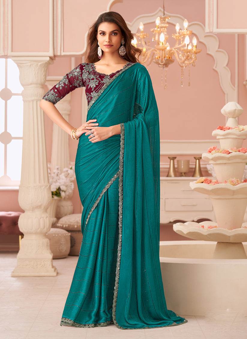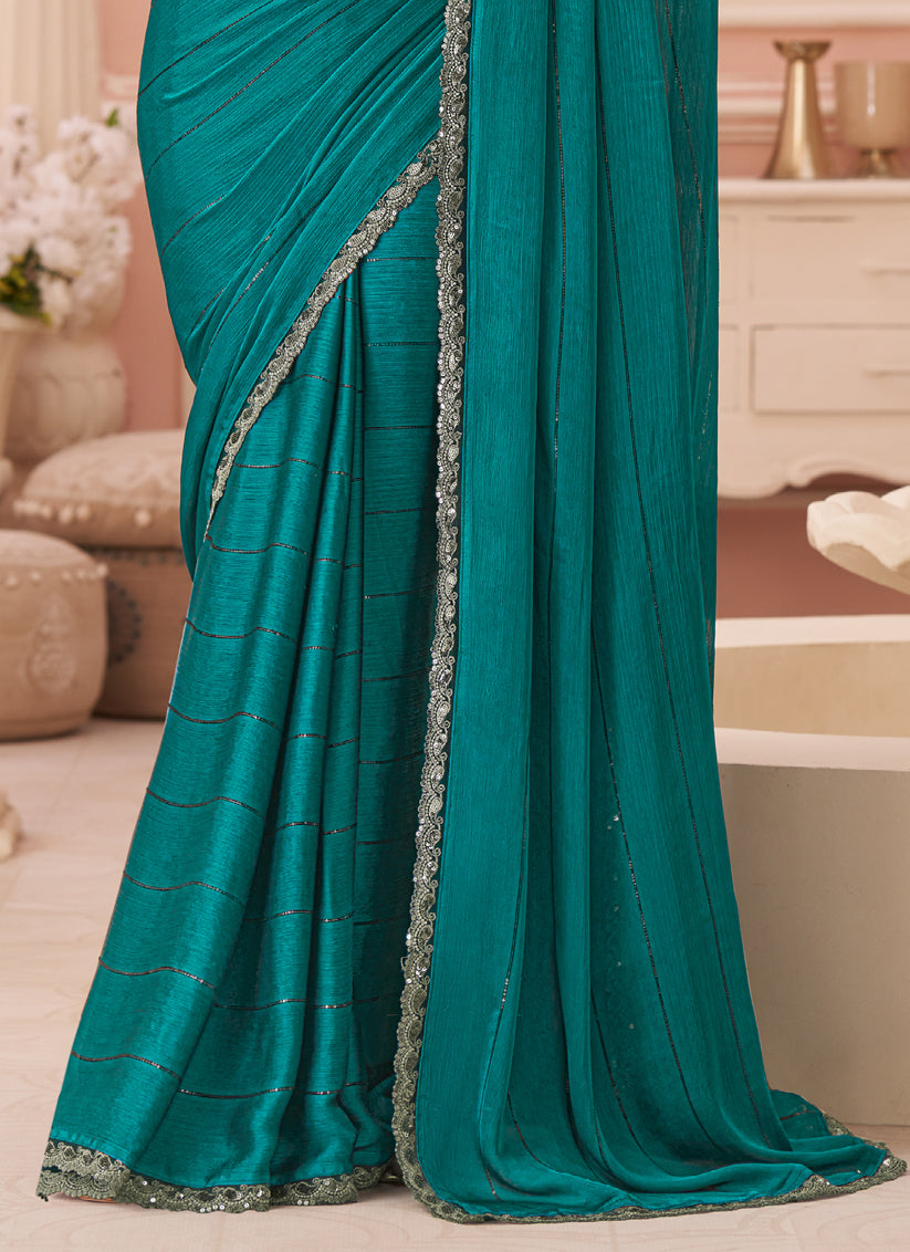 Ravishing Rama Green Embroidered Satin Party Wear Saree
