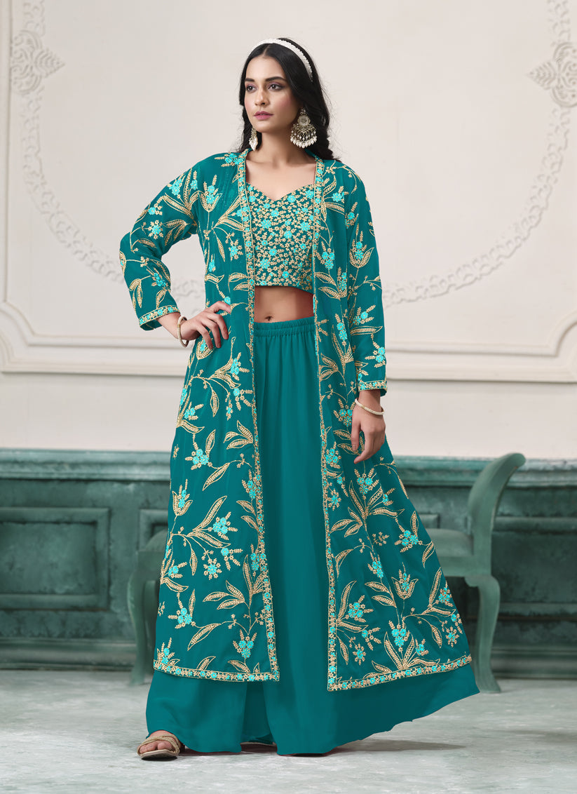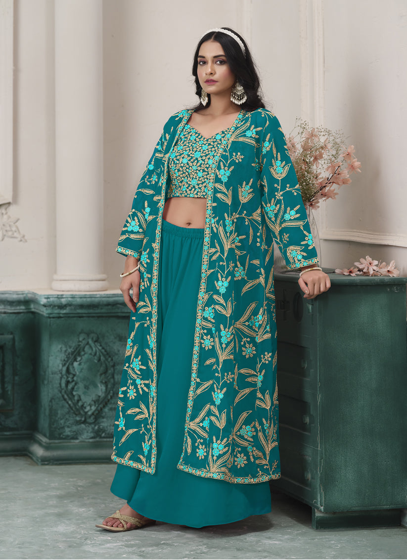 Rama Green Faux Georgette Embroidered Readymade IndoWestern Fabric: Top - Faux Georgette, Bottom - Faux Georgette, Dupatta - Faux Georgette... Read more