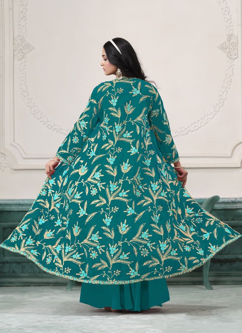 Luxurious Rama Green Faux Georgette Embroidered Readymade IndoWestern