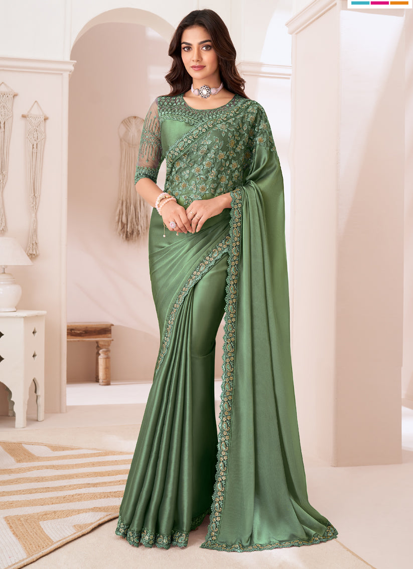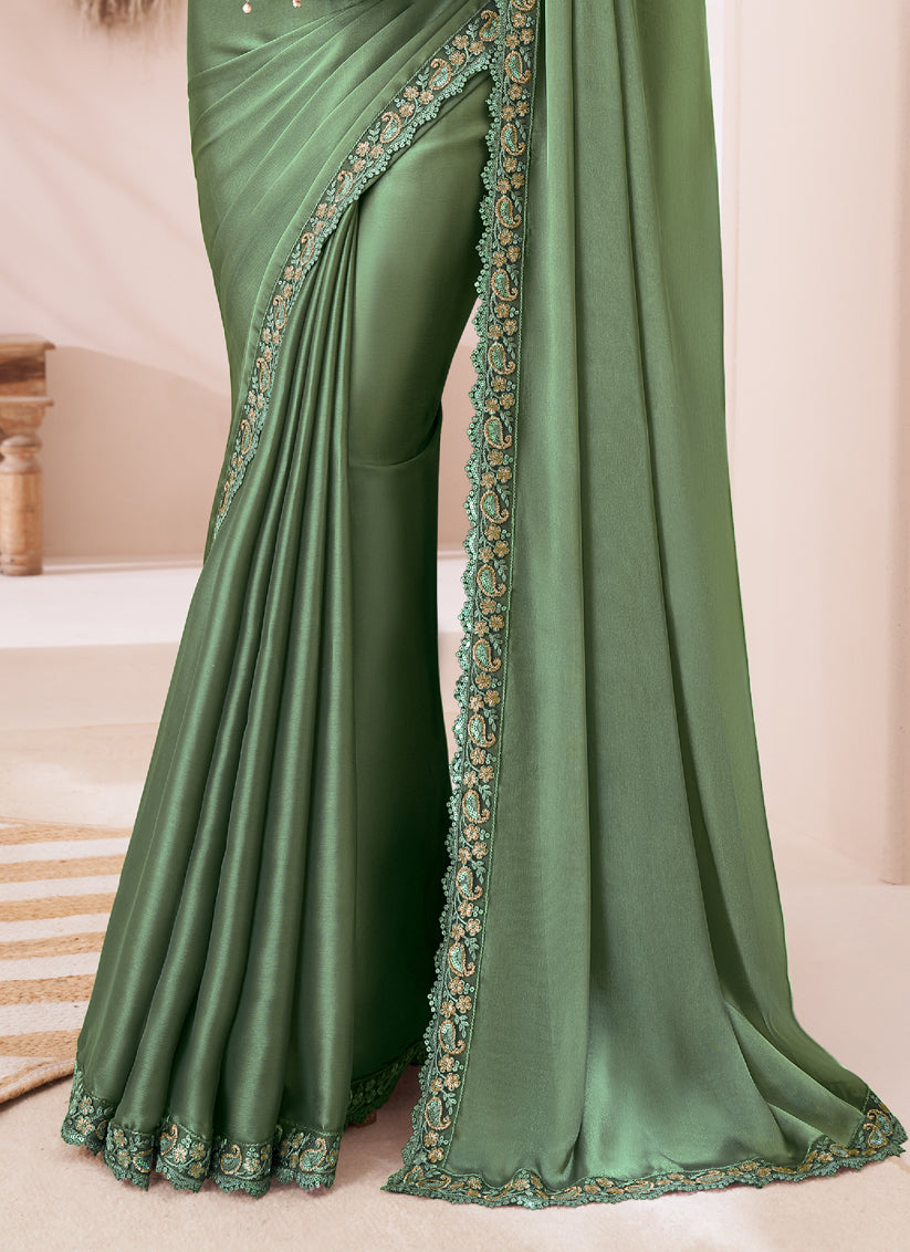Awesome Sage Green Satin Silk Embroidered Wedding Saree