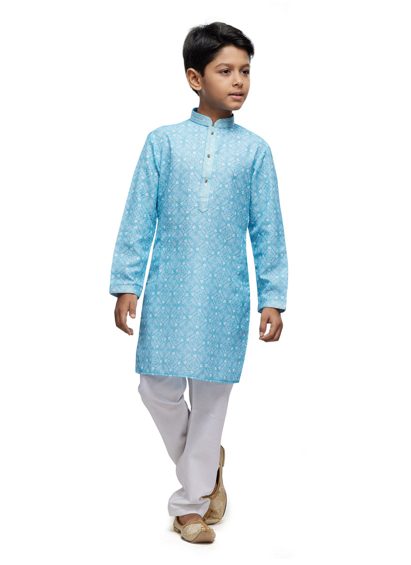 Sky Blue Boys Kurta Pyjama Set Fabric: Top - Cotton, Bottom - Art Banarasi Silk Work: Digital Print Dispatch Time:... Read more