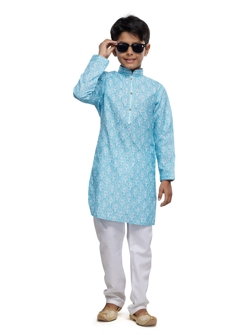 Sky Blue Boys Kurta Pyjama Set Fabric: Top - Cotton, Bottom - Art Banarasi Silk Work: Digital Print Dispatch Time:... Read more