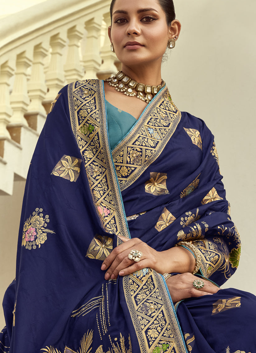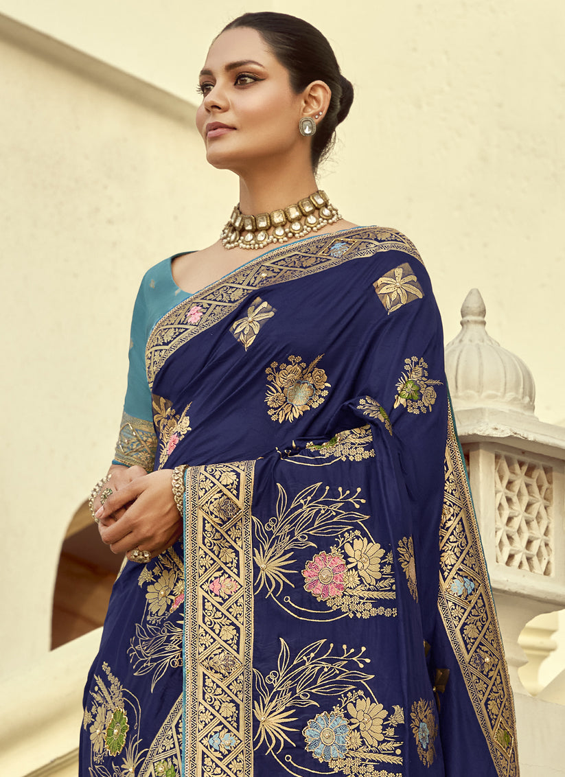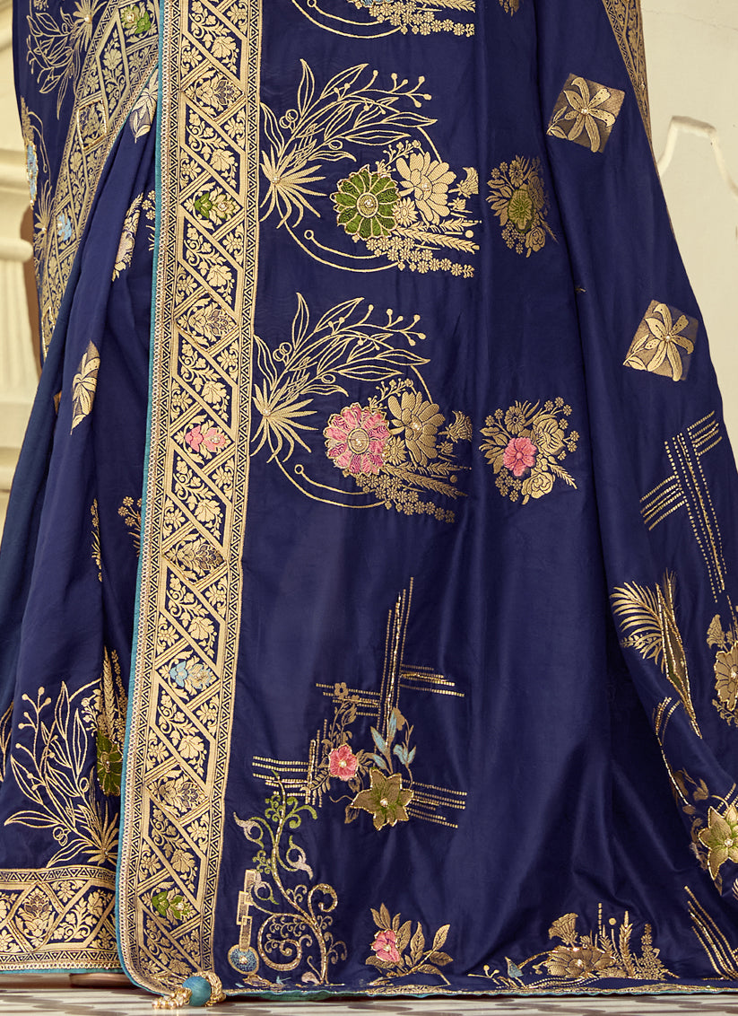 Sophisticated Navy Blue Dola Silk Handwork Wedding Saree