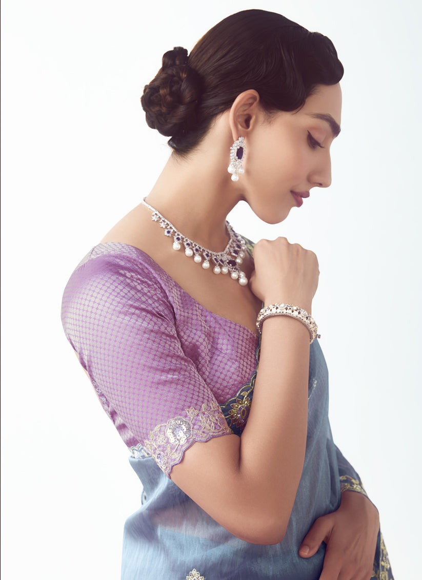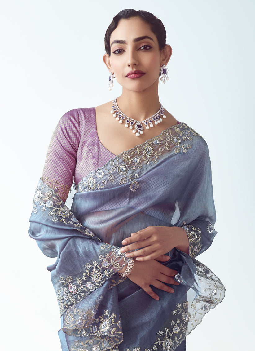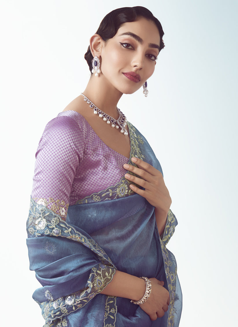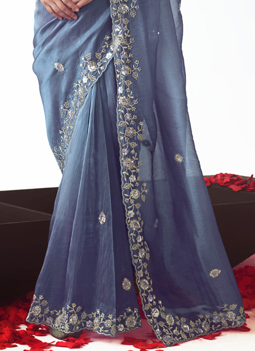 Stunning Slate Blue Tissue Organza Embroidered Wedding Saree