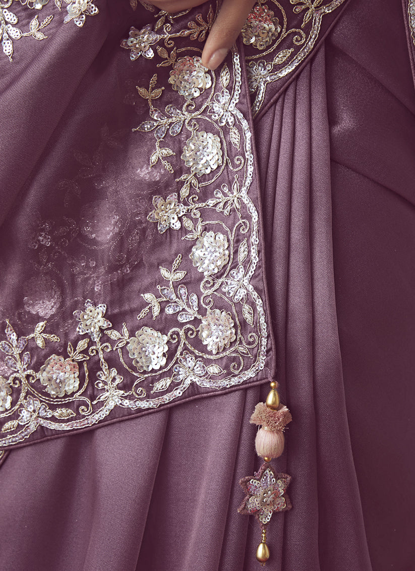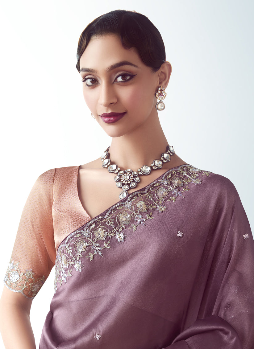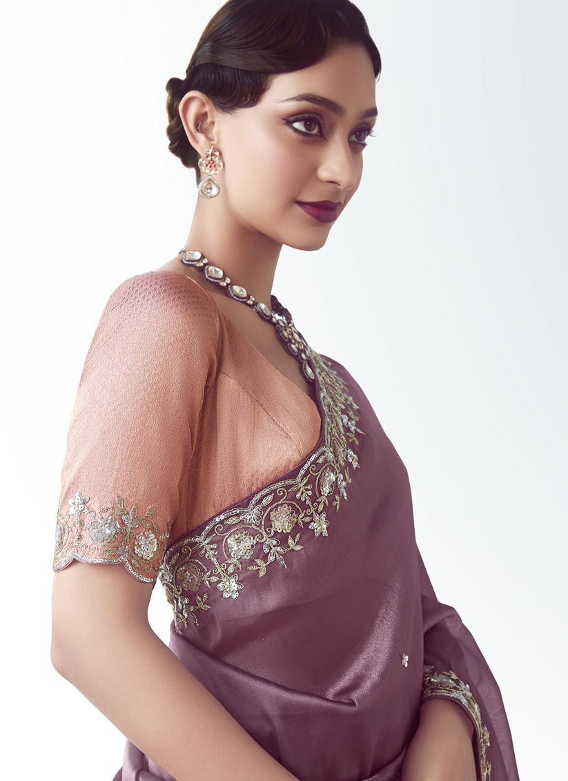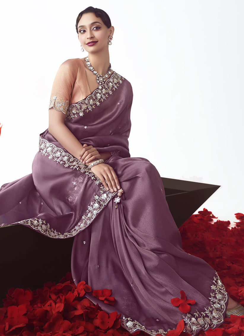 Unique Dusty Wine Tissue Organza Embroidered Wedding Saree