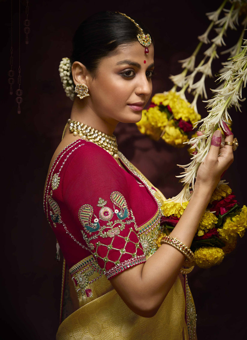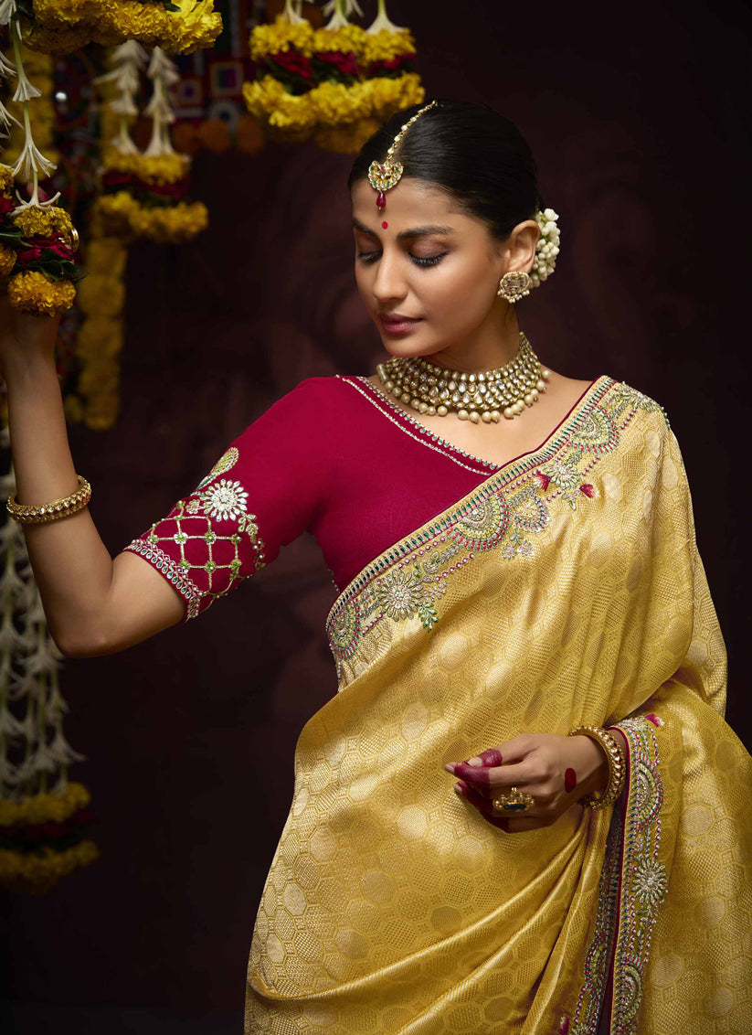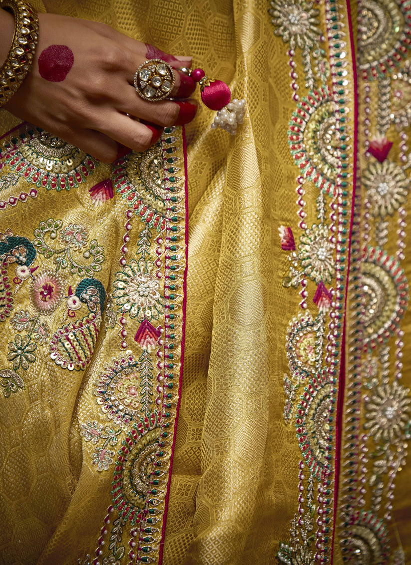 Voguish Pastel Yellow Pure Banarasi Kanjivaram Saree for Wedding