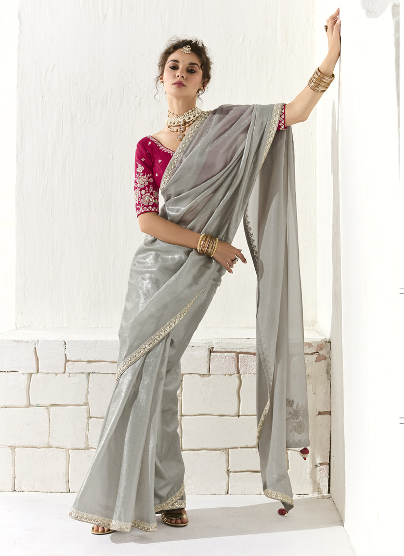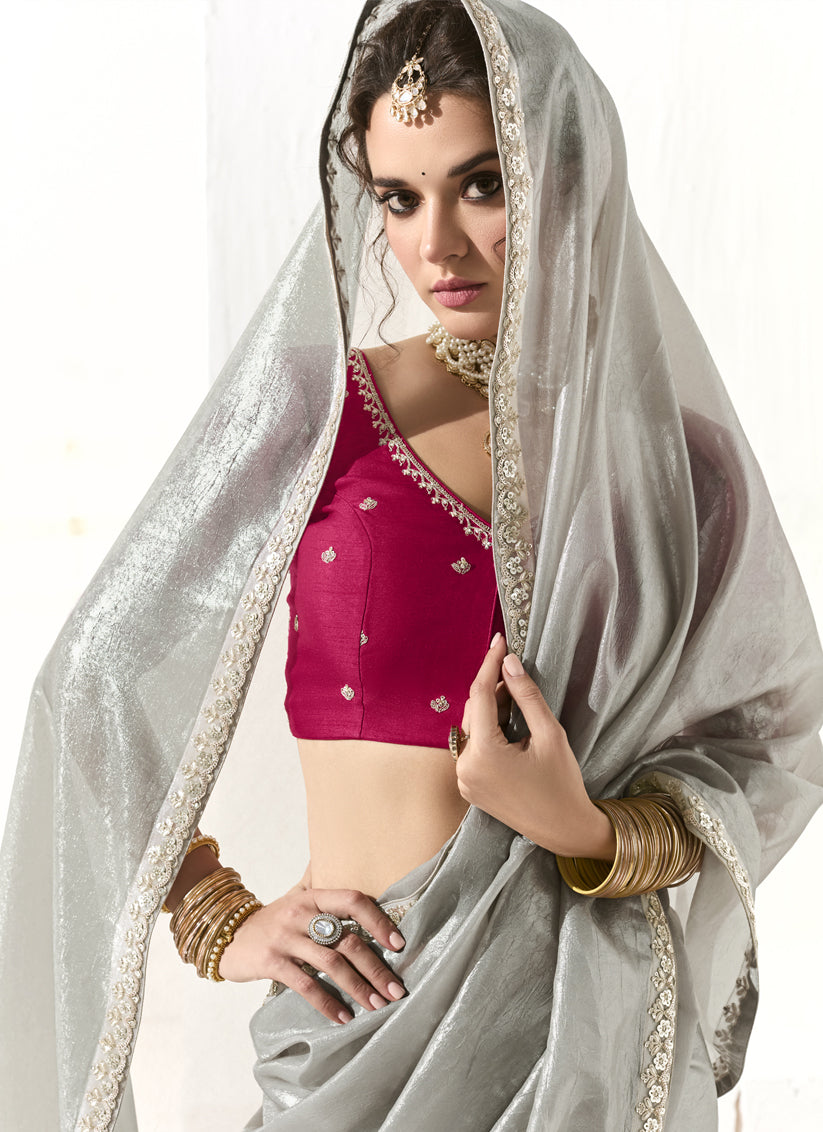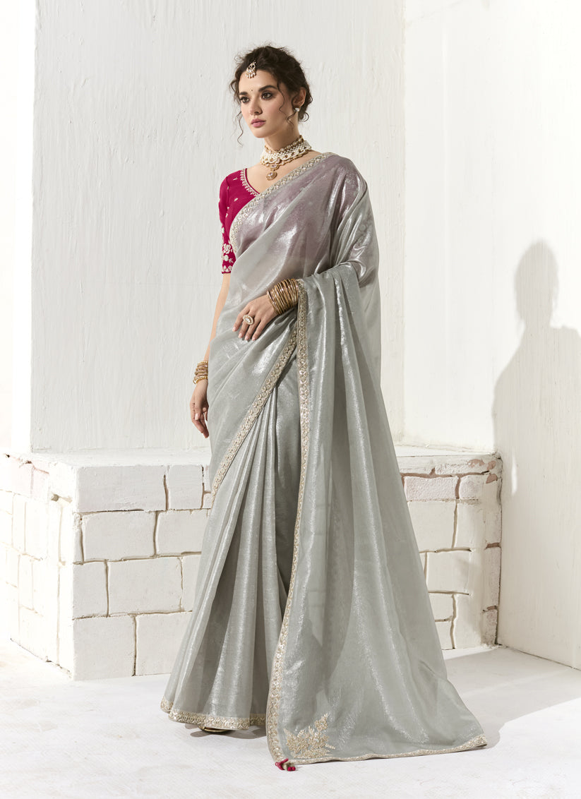 Wonderful Silver Tissue Embroidered Designer Wedding Saree